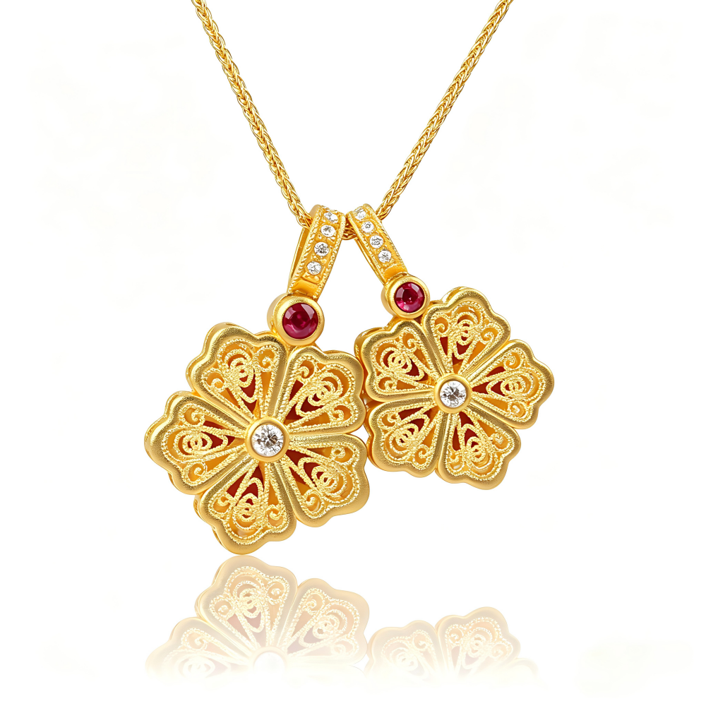 足金红牡丹点钻吊坠